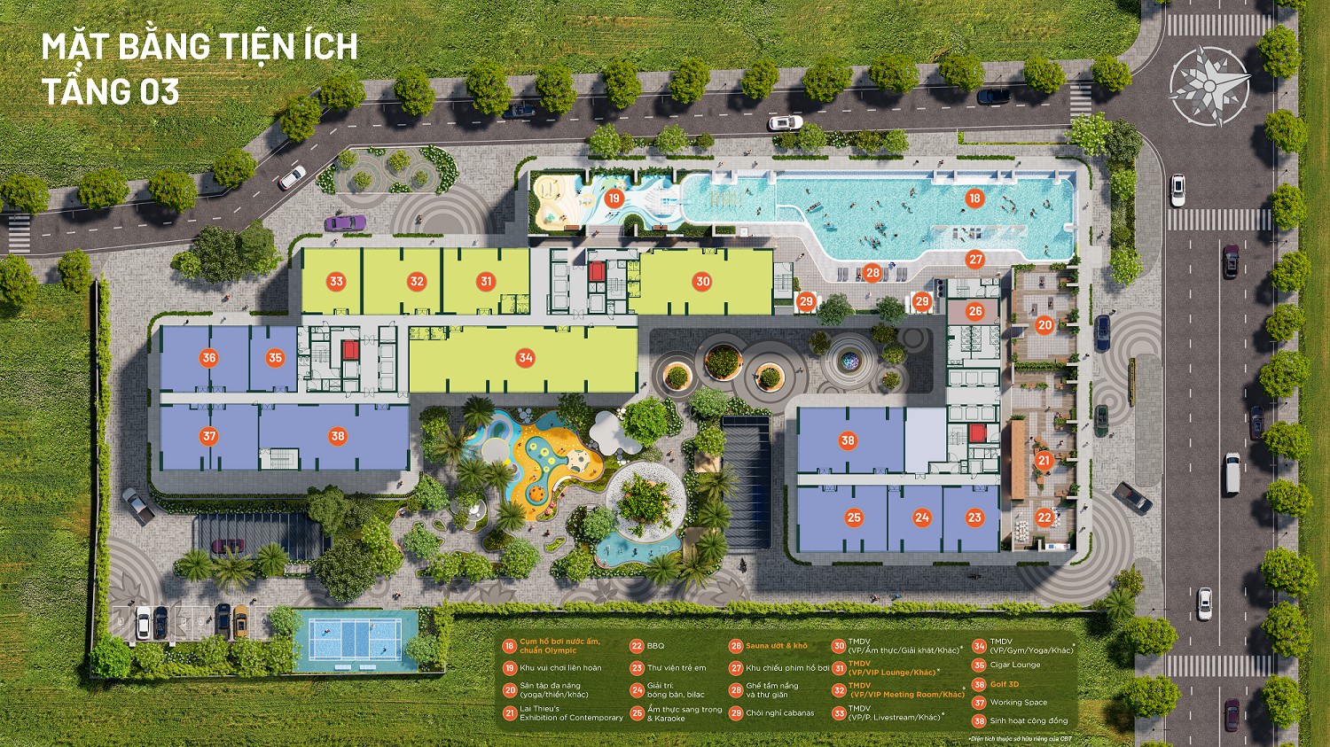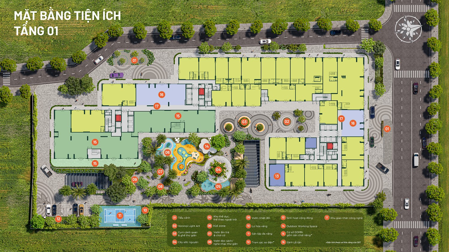 Không gian xanh: Công viên trung tâm, đường dạo bộ, vườn thiền và khu vực yoga ngoài trời.